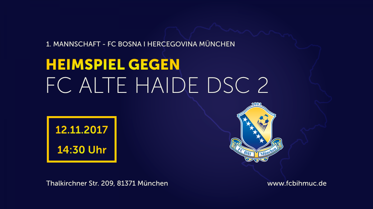 1. Mannschaft - Heimspiel: FC Bosna i Hercegovina München - FC Alte Haide-DSC II Datum: Sonntag, 12. November 2017 | Uhrzeit: 14:30 Uhr | Ort: Thalkirchner Str. 209, 81371 München